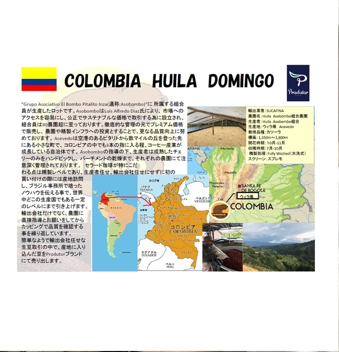 “Grupo Asociativo El Bombo Pitalito Inza(通称Asobombo)‘’に所属する組合員が生産したロットです。AsobomboはLuis Alfredo Diaz氏により、市場へのアクセスを容易にし、公正でサステナブルな価格で取引する為に設立され、組合員は80農園超に至っております。徹底的な管理の元でプレミアム価格で販売し、 農園や精製インフラへの投資とすることで、更なる品質向上に努めております。Acevedo は空港のあるピタリトから数マイルの丘を登った先にある小さな町で、コロンビアの中でも3本の指に入る程、コーヒー産業が成長している自治体です。 Asobombo の指導の下、生産者は成熟したチェリーのみをハンドピックし、パーチメントの乾燥まで、それぞれの農園にて注意深く管理されております。セラード珈琲が特にこだわる点は精製レベルであり、生産者任せ、輸出会社任せにせずに初の買い付けの際には産地訪問し、ブラジル事務所で培ったノウハウを伝える事で、世界中どこの生産国でもある一定のレベルにまで引き上げます。輸出会社だけでなく、農園に直接指導とお願いをしてからカッピングで品質を確認する事を繰り返しています。簡単なようで輸出会社任せな生豆取引の中で、産地に入り込んだ豆をProdutor ブランドにて売り出します。