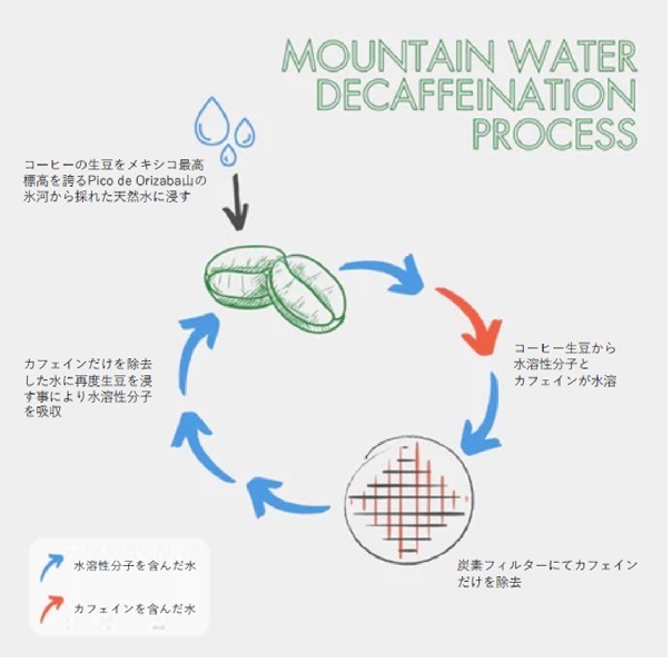 精製処理:24-36時間の浸⽔式発酵、パティオにて7-10⽇間の天⽇乾燥後、Mountain water プロセスにてカフェイン99.9%除去