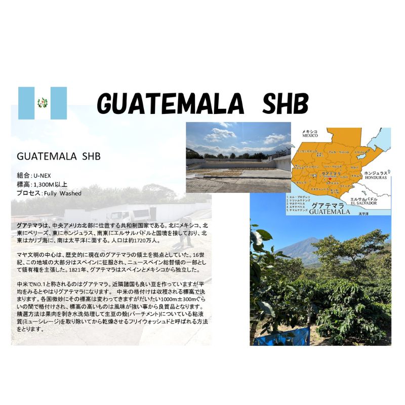 中米ではコーヒー豆の格付けは標高によって決まります。グアテマラでは1,000m±300mを基準とし、高地で収穫される豆は風味が豊かで良質とされます。また、主に用いられるのは「フリイウォッシュド(Fully Washed)」という水洗式の精製方法で、果肉を除去し、ぬめり(ミューシレージ)を取り除いてから乾燥されます。これにより、クリーンで明るい風味が生まれます。
