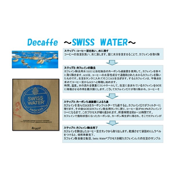 世界で唯一、化学薬品を一切使用しないカフェイン除去法のブランド Swiss Water Decaffeinated Coffee Companyは、この業界での長い業務経験の間にコーヒー豆からのカフェイン除去方法が様々に編み出されては、また消えていくのを目の当たりにしてきました。絶えず改良を目指しています。その改良の歴史の語り口は折々変わってきたかもしれませんが”一つだけ”変わらないものがあります。それはSwiss Water??プロセスは化学薬品を 一切使用せずに99.9%のカフェイン除去を保証する、世界で唯一の方法だということです。《味覚特徴》
